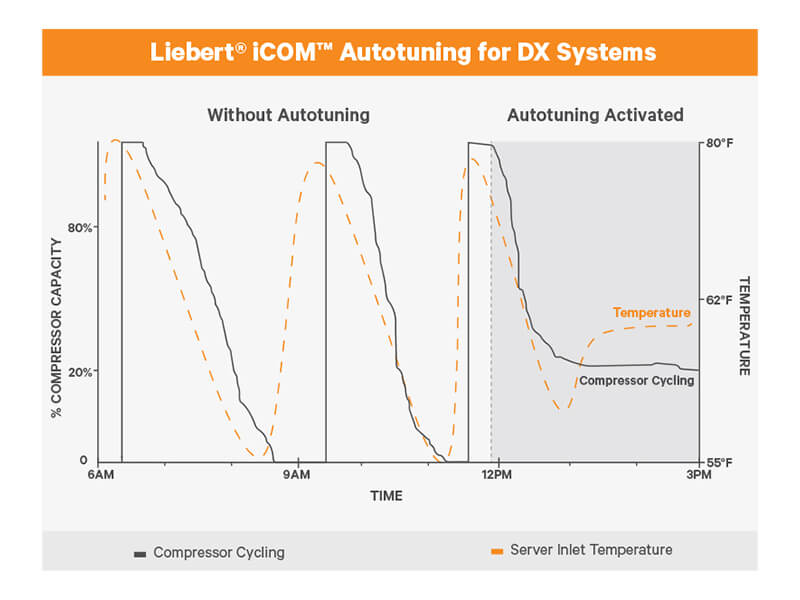 Featuring machine learning and self-optimizing algorithms, Liebert iCOM Autotuning replaces your system’s wild fluctuations with steady, high-efficiency performance.