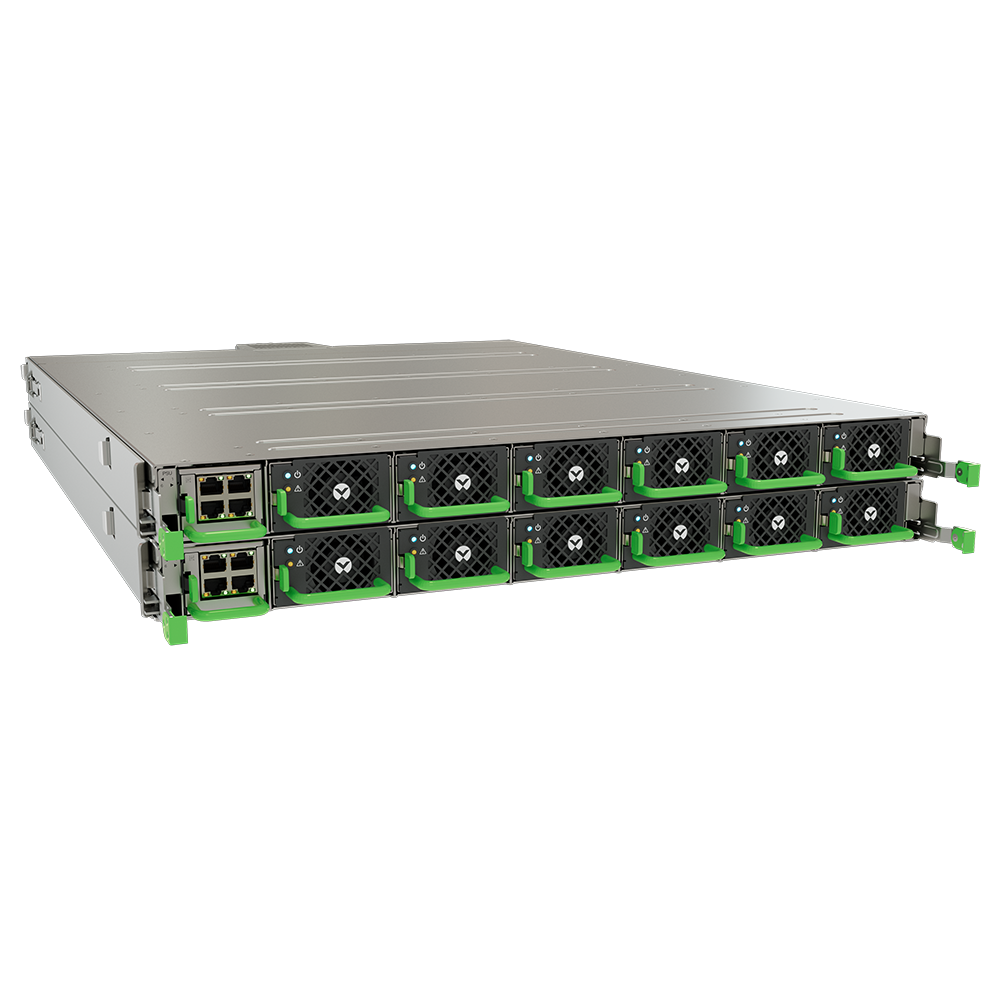 The PowerDirect Rack 33kW 50V DC Power System is a high-density, scalable DC power system designed for modern data centers and Open Compute ORV3 environments. This modular system offers up to 132 kW per rack with high-efficiency power supply units (PSUs). The flexible design allows live addition of power shelves and PSUs for seamlessly expansion as power needs increase. It has a power management module (PMM) that optimizes power distribution and monitoring of up to 48 PSUs. Ideal for high-capacity server setups, it maximizes power efficiency and minimizes space requirements.