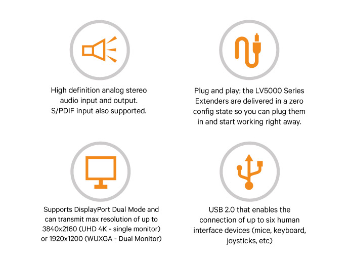 High-definition Display Port Video - Supports Display Port Dual Mode (DP++) and can transmit maximum resolution of up to 3840x2160 (UHD 4K)with a single monitor, or two 1920 x 1200 (WUXGA) video streams in a dual monitor configuration. USB 2.0 - Enables connection of up to six USB human interface devices including mice, keyboards, graphics tablets,touchscreens, jog shuttles, joysticks, 3D explorers, mass storage devices and isochronous devices like webcams and headsets. HD-quality - High definition analog stereo audio input and output. S/PDIF input also supported. Plug and play - The LV5000 Series extenders are delivered in a zero configuration state so you can plug them in and start working right away. There’s no need for drivers or software to be installed. (Full USB 2.0 requires a second cable)