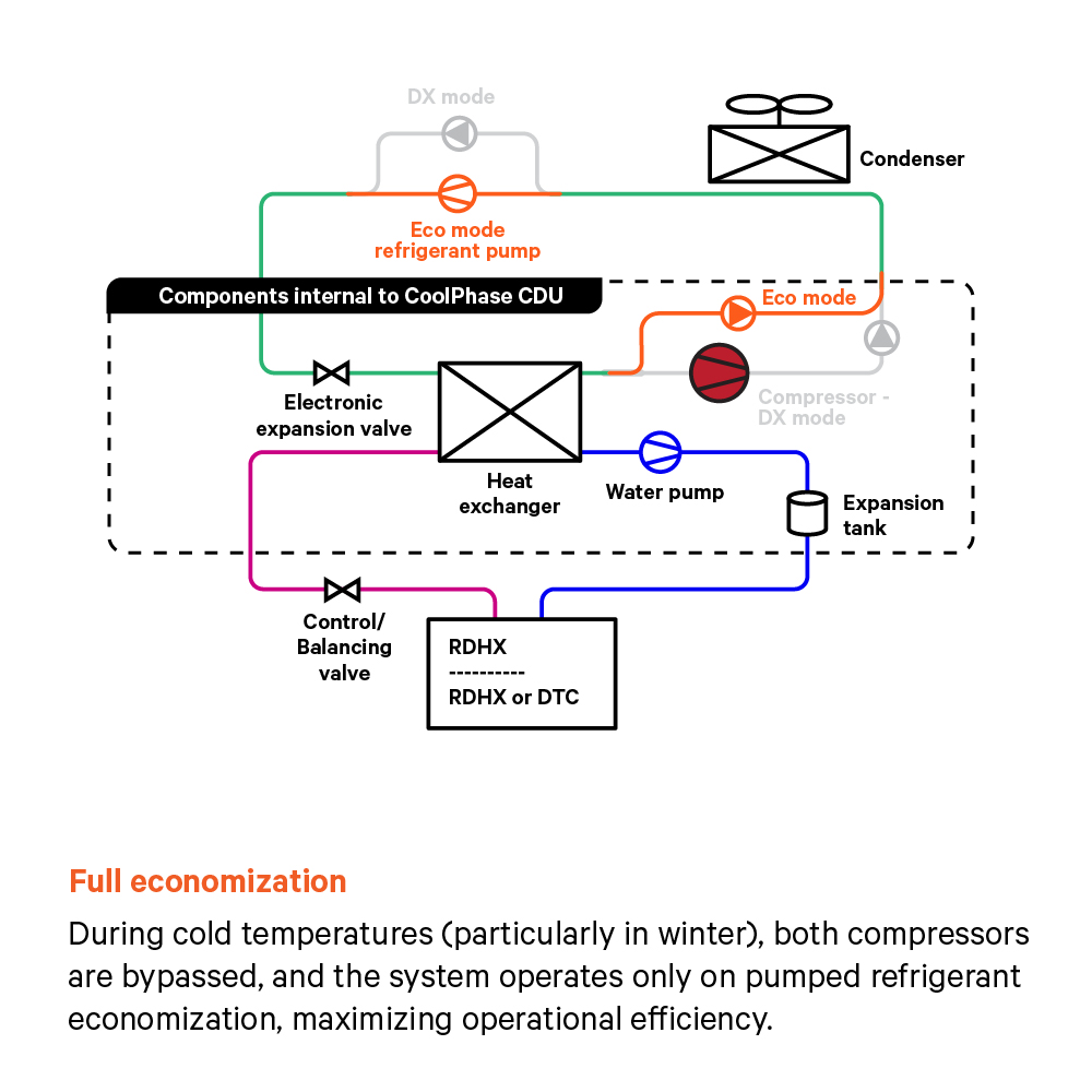 The Vertiv™ CoolPhase CDU removes the traditional barriers of needing a centralized chiller to deploy direct-to-chip liquid cooling. It gives you a cost effective, flexible means for deploying high density racks where you need them to support advanced applications. It has a compact footprint, modular format, and up to 320 kW of heat rejection. Using Pumped Refrigerant Economization (PRE) in the primary loop to the Vertiv™ Liebert® MCV high density condenser, the CoolPhase CDU removes heat from the secondary fluid network (SFN) in an internal liquid-to-refrigerant heat exchanger. This internal heat exchanger design chills the fluid in the SFN to optimal temperatures to deliver high-density cooling to direct-to-chip cold plates or to rear door heat exchanger (RDHx) such as Vertiv™ Liebert® DCD. The CoolPhase CDU PRE heat rejection takes advantage of seasonal conditions to adjust the level of economization, delivering increased cost savings throughout the year.